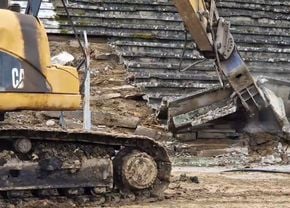 În imagini, se pot observa buldozere și excavatoare care au intrat deja pe teren și au început să dărâme structura stadionului.