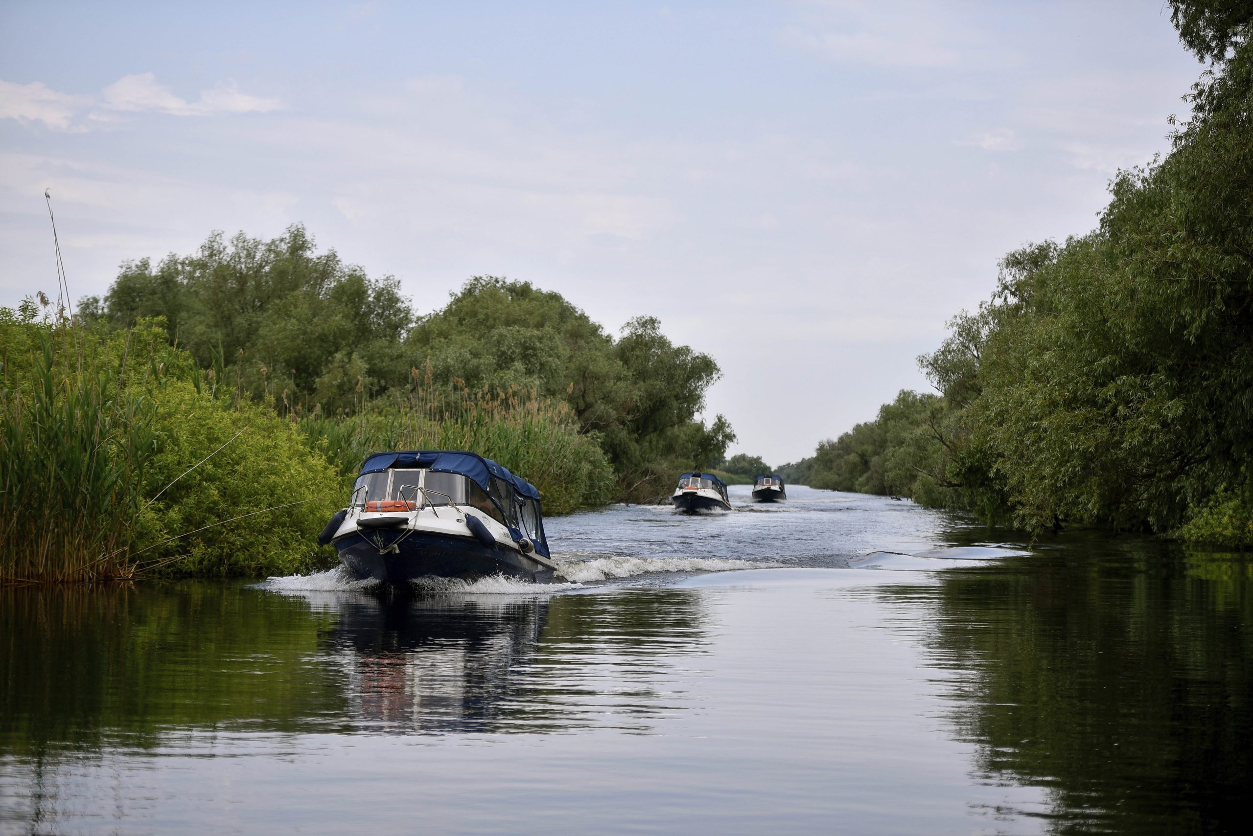 Turişti cu barca pe un canal din apropiere de braţul Sulina al Deltei Dunării, judeţul Tulcea, 4 iunie 2023. Inquam Photos / Alex Nicodim