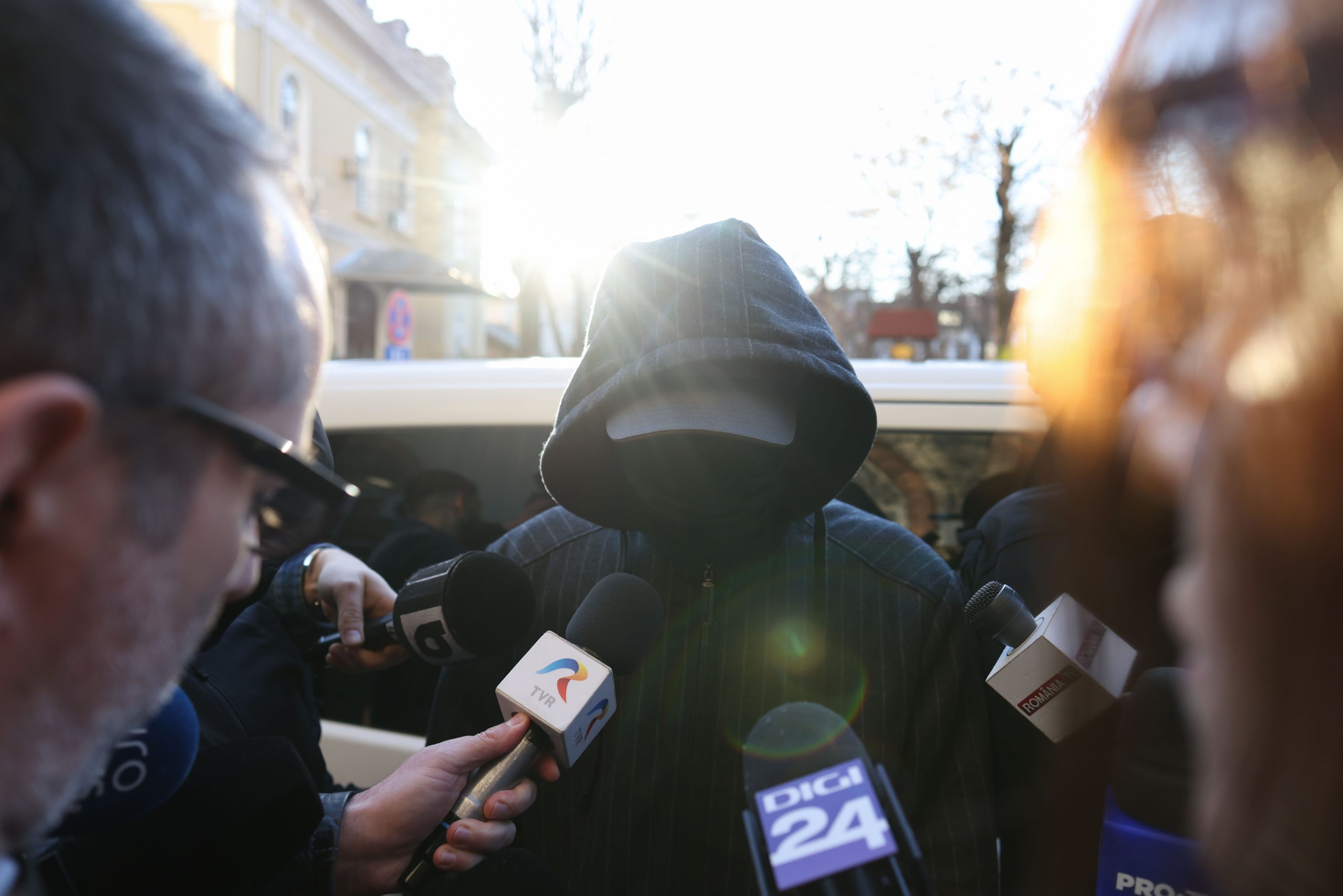 Influencerul Bogdan Peșchir a fost adus la București pentru audieri, fiind obligat să-și scoată masca, șapca și ochelarii pentru identificare.