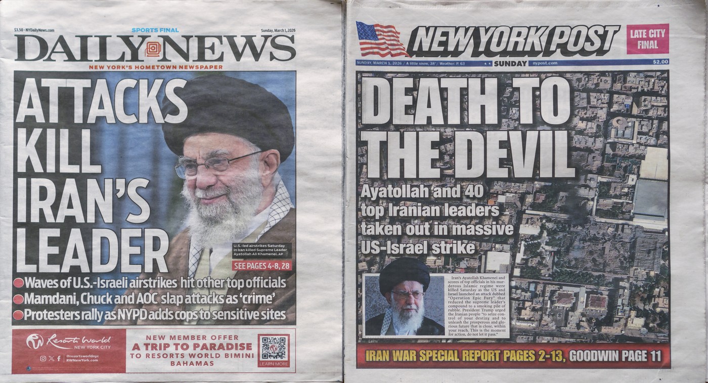 Fotografia este însoțită de un caption care precizează: „Prima pagină a ziarelor anunță moartea Liderului Suprem. FOTO: Richard B. Levine / Sipa USA / Profimedia”.