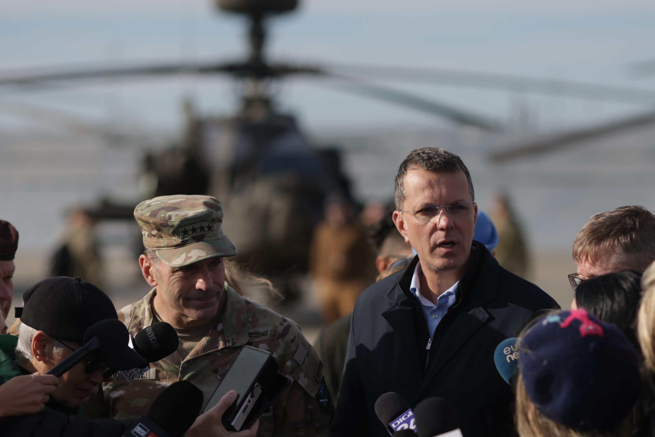 Ionuț Moșteanu, alături de generalul Christopher Donahue, comandantul Forțelor Terestre ale SUA în Europa și Africa, la o conferință de presă desfășurată la Baza 57 Mihail Kogălniceanu din județul Constanța, pe 25 noiembrie 2025, FOTO: Inquam Photos / George Călin
