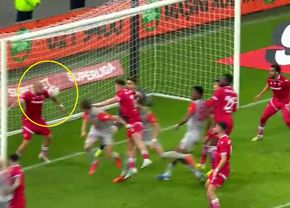 Portarul danez a păruț că a atins mingea cu umărul. Arbitrul central, Florin Andrei, a decis continuarea jocului cu un corner, iar observatorul VAR, Cătălin Popa, nu a intervenit.