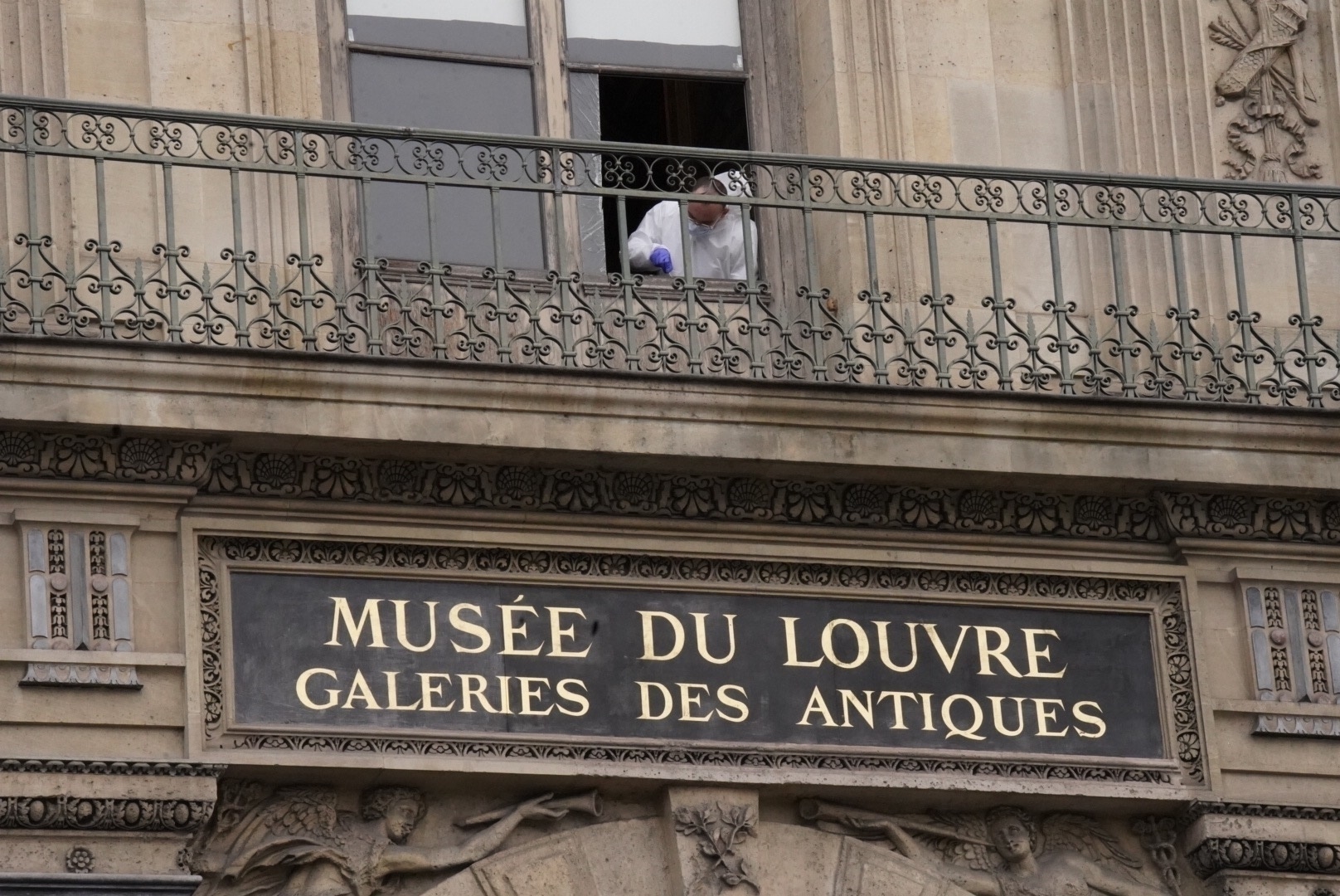 Specialist al poliției franceze examinând geamul utilizat de infractori pentru a pătrunde în muzeul Luvru și a sustrage bijuterii. Foto: BSST / BACKGRID / Backgrid USA / Profimedia