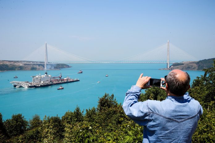 „Pioneering Spirit”, o navă specializată în instalarea conductelor, surprinsă în timp ce traversa Bosforul spre portul Anapa din Rusia, pentru a lucra la proiectul gazoductului TurkStream, FOTO: Muhammed Gencebay Gur / AFP / Profimedia Images