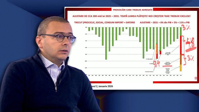 „De ce sunt ÎNCREZĂTOR (nu „optimist” sau „idealistic”) că toate reformele necesare se vor implementa în următorii 3-4 ani. DOAR UN GRAFIC! O MARE PROBLEMĂ: Mărimea ajustării este de minim 11% din PIB, echivalentul a aproximativ 200 miliarde de lei! Până în 2030 trebuie să obținem acești bani. În cazul în care nu reușim = faliment. Oricine crede că acești bani pot fi obținuți doar din creșterea taxelor (în detrimentul sectorului privat) este deconectat de realitate. Alte taxe NU mai trebuie majorate, a afirmat recent Premierul Bolojan la Radio România Actualități. Oricine crede că se poate amâna sau evita reforma din sectorul public, cu toate implicațiile, este deconectat de la viitorul apropiat. SE VA ÎNTAMPLA! Nu avem alternative. Fondurile sunt epuizate, creditorii întrerup finanțarea. Sub presiunea factorilor externi, trebuie să acționăm. Resursele osului sunt pe sfârșite, nu mai rămâne carne. Gata.”