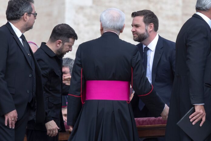 Președintele ucrainean Volodimir Zelenski și vicepreședintele american JD Vance au participat la o ceremonie religioasă, în timp ce oficiali din alte state discută despre evoluțiile geopolitice legate de sprijinul pentru Ucraina.