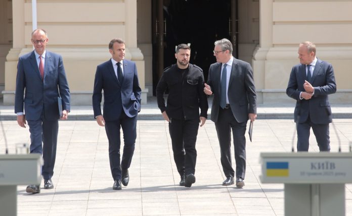 Friedrich Merz, Emmanuel Macron, Volodimir Zelenski, Keir Starmer și Donald Tusk în Kiev Foto: Hennadii Minchenko / UkrInform / Profimedia