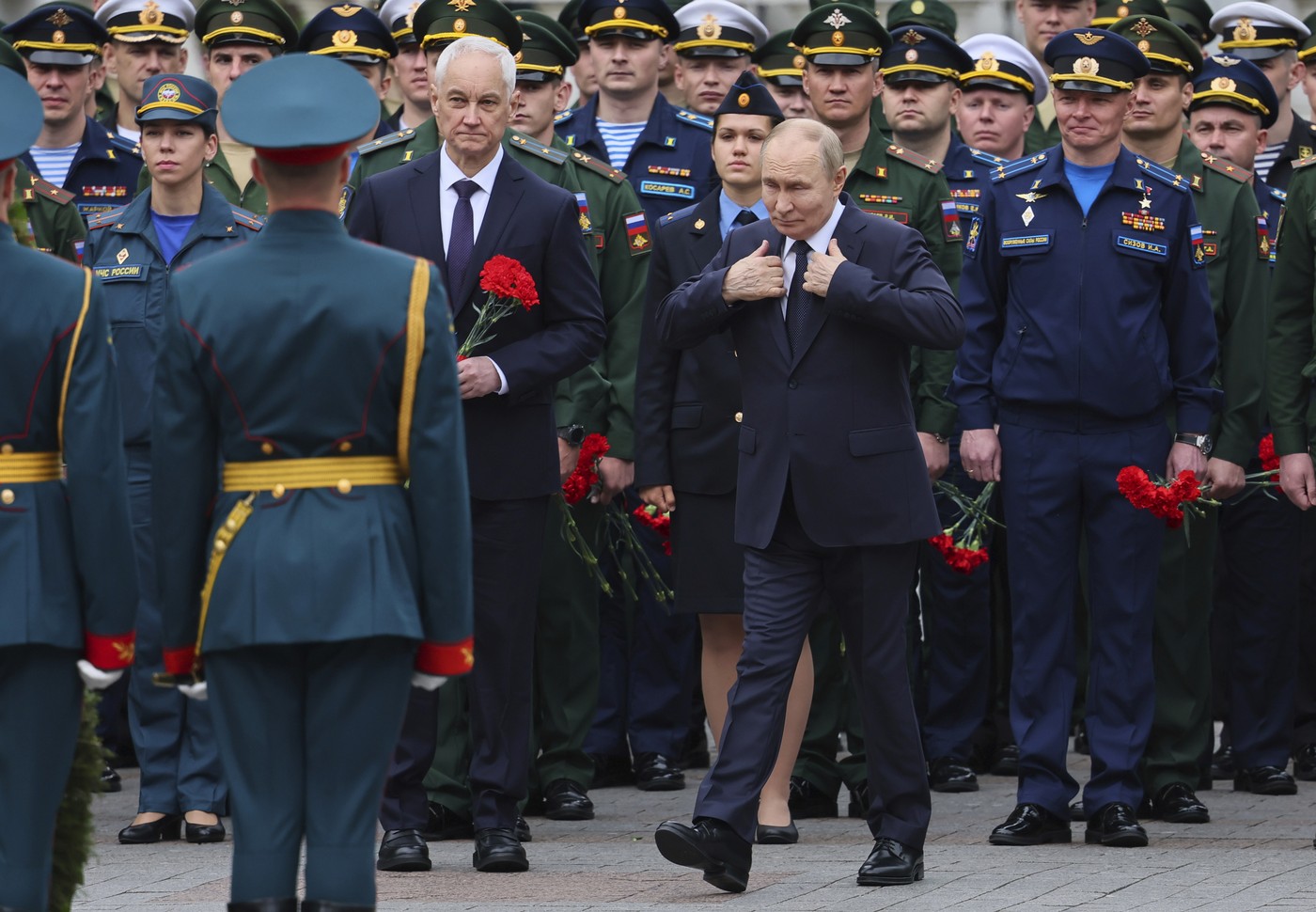 Ministrul rus al apărării, Andrei Belousov, alături de președintele Vladimir Putin la o ceremonie militară organizată în data de 22 iunie, FOTO: Yuri Kochetkov / AP / Profimedia Images