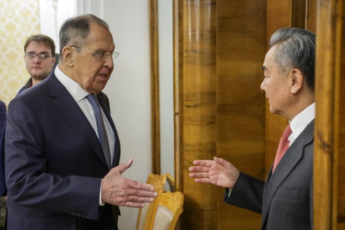 RUSIA, MOSCOVA – 2 DECEMBRIE 2025: Ministrul rus al Afacerilor Externe, Serghei Lavrov (stânga), și omologul său chinez, Wang Yi, își strâng mâinile în timpul unei întâlniri. FOTO: Mikhail Sinitsyn / Zuma Press / Profimedia