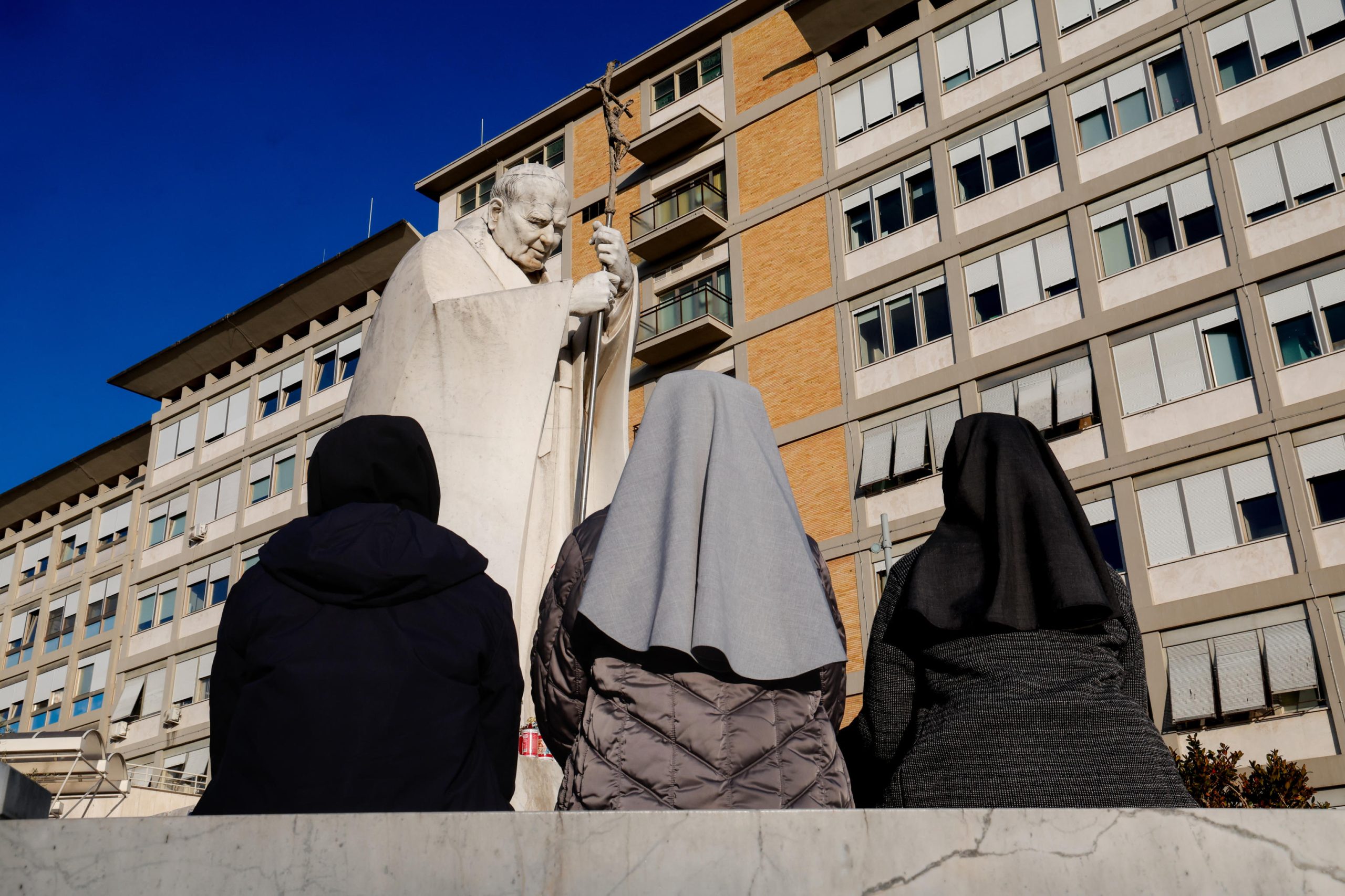 Călugărițe rugându-se lângă o statuie a fostului Papă Ioan Paul al Doilea în fața spitalului Gemelli unde este internat Papa Francisc: Giuseppe Lami / Zuma Press / Profimedia