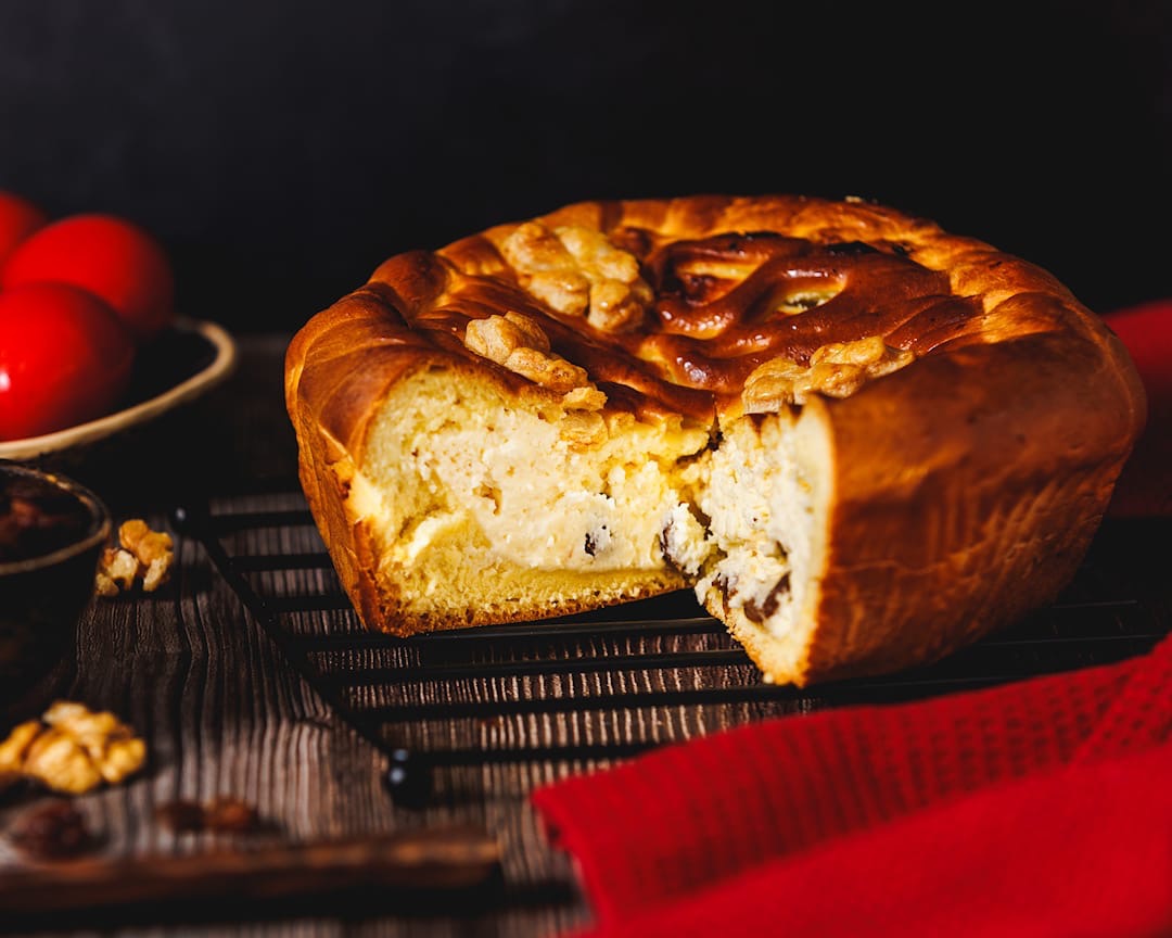 Aluatul dospit se întinde într-o tavă rotundă de 24-26 cm, păstrând o parte pentru marginile prăjiturii. Se toarnă crema de brânză și se nivelează. Pasca se coace la 170-180°C timp de circa 50 de minute, până capătă o crustă aurie. Se răcește treptat, cu ușa cuptorului întredeschisă, pentru a evita crăparea.