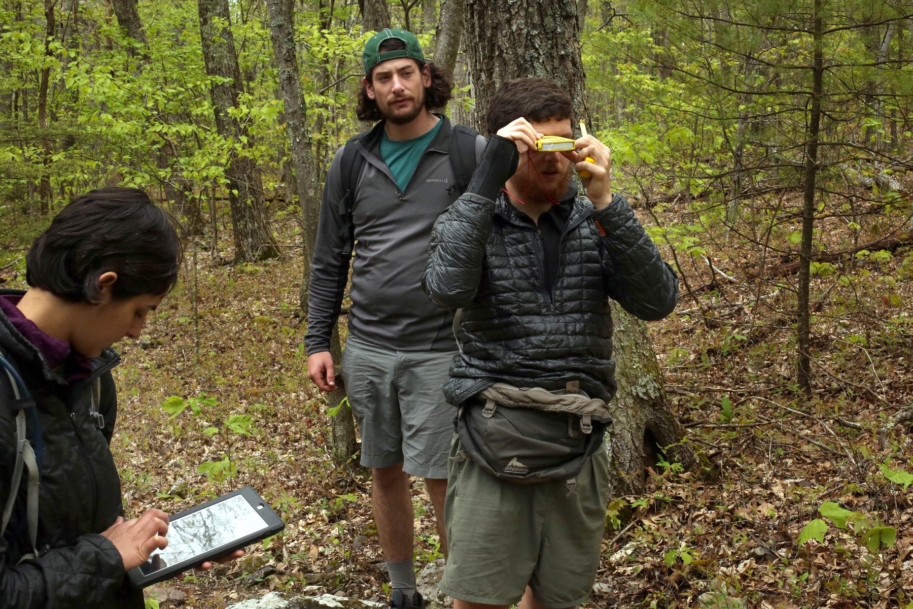 Oameni orientându-se într-o pădure cu ajutorul unor dispozitive electronice (imagine ilustrativă).