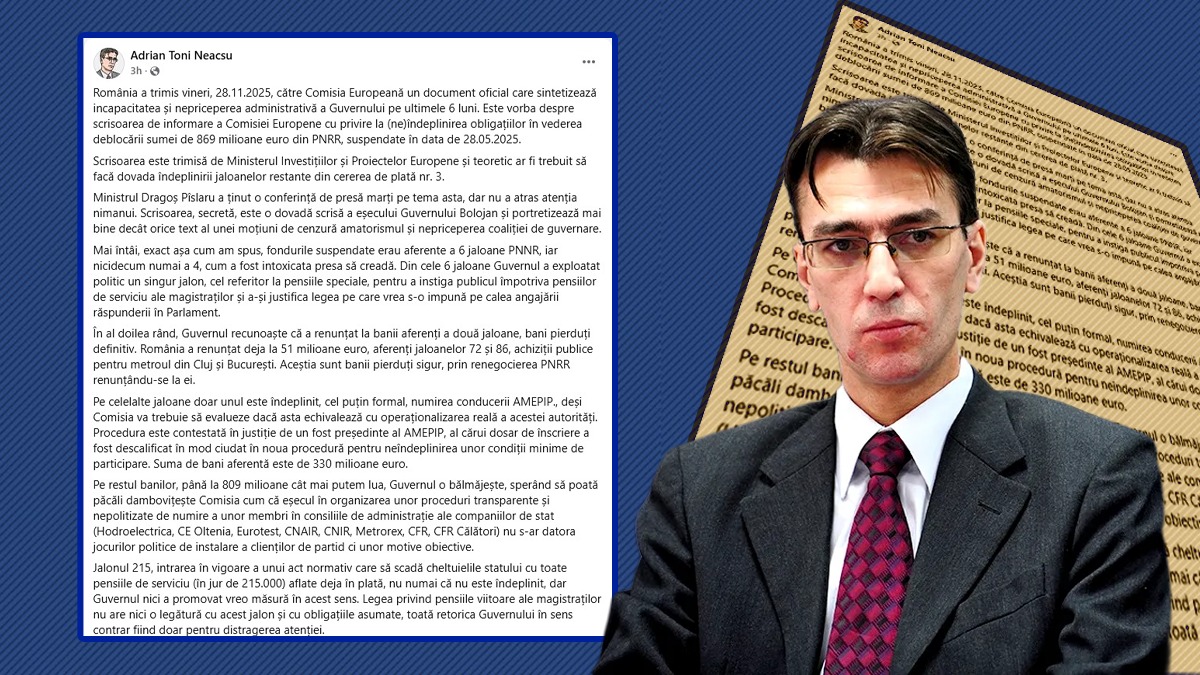 Toni Neacșu, fost membru al Consiliului Superior al Magistraturii, afirmă că documentul trimis de Ministerul Investițiilor și Proiectelor Europene către Comisia Europeană referitor la neîndeplinirea condițiilor necesare pentru deblocarea fondurilor de 869 de milioane de euro din PNRR, suspendate la data de 28 mai 2025, reprezintă „o sinteză oficială a incapacității și nepriceperii administrative a Guvernului în ultimele șase luni.”