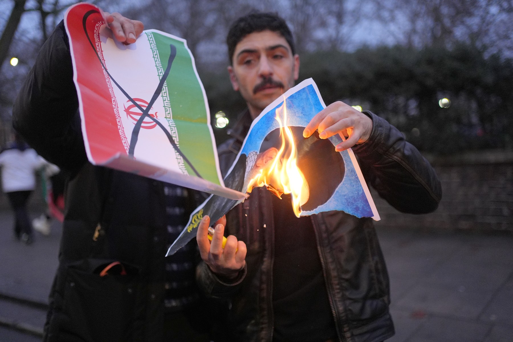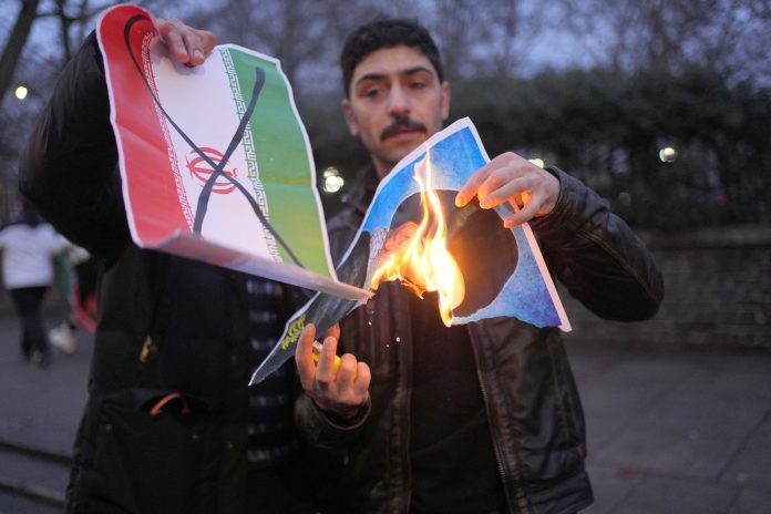 Imagine a liderului suprem al Iranului, ayatollahul Ali Khamenei, fiind incendiat de un protestatar în fața ambasadei iraniene din Londra, pe 12 ianuarie 2026. Fotografie ilustrativă. FOTO: Yui Mok / PA Images / Profimedia