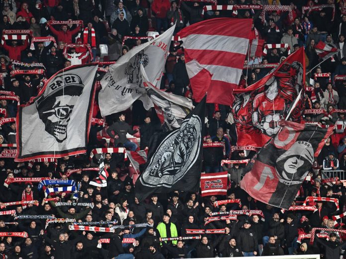 Imagini ilustrative – Susținătorii echipei UTA Arad își încurajează favoriții la meciul de fotbal cu FCSB, desfășurat pe Stadionul Francisc Neuman din Arad, pe 26 ianuarie 2025. FOTO: Razvan Pasarica/SPORT PICTURES / imago sportfotodienst / Profimedia