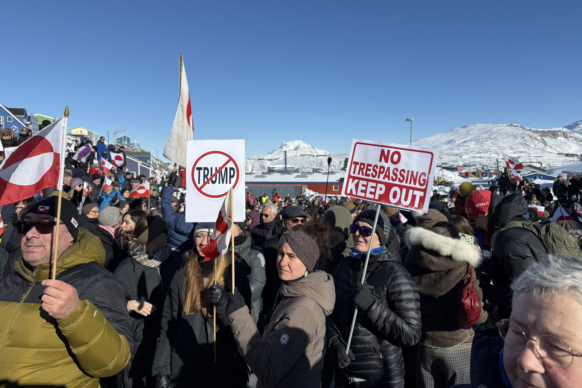 Pe 15 martie, fostul premier Mute B. Egede și noul parlamentar Jens-Frederik Nielsen au condus o demonstrație cu sute de inuiți în Nuuk, afișând steagul Groenlandei și mesaje precum „Respectați suveranitatea Groenlandei”, „Nu suntem de vânzare” și „Make America Go Away” – adaptarea sloganului lui Trump, „Make America Great Again”. Protestatarii s-au manifestat și în alte orașe de pe insulă, în fața consulatului SUA din Nuuk.