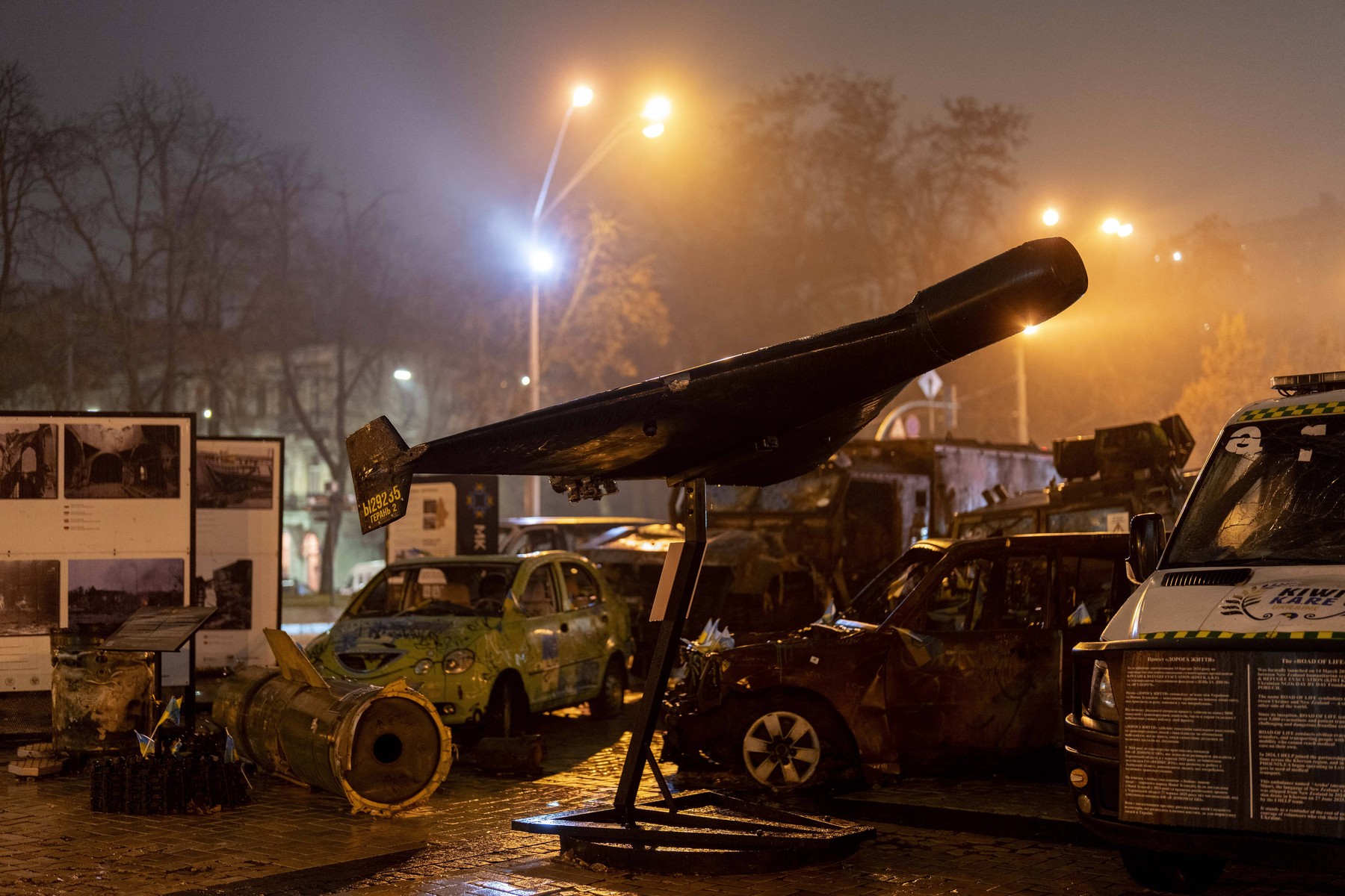 O dronă de tip Shahed (Geran-2, fabricată în Rusia), expusă alături de tancuri și echipamente militare rusești distruse în piața Mykhailivska din Kiev, la data de 20 noiembrie 2025. FOTO: Andreas Stroh / imago stock and people / Profimedia